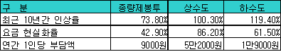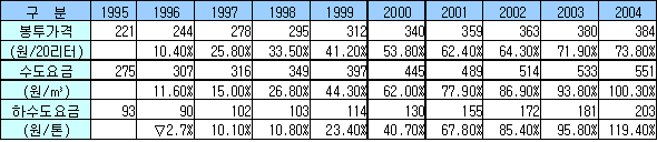 상ㆍ하수도 요금에 비해 종량제 봉투 인상폭이 적은 것은 지자체가 주민들의 부담가중을 우려해 인상을 자제하고 있기 때문이다. 쓰레기 종량제 봉투 가격을 최종 결정하는 것은 지자체인데 봉투가격을 올리면 주민들의 부담이 가중되고, 봉투값이 비싸면 비용을 아끼려고 자칫 불법투기를 할 가능성이 높아 인상을 자제하고 있는 것으로 알려졌다. 쓰레기 종량제 봉투의 가격인상폭이 상대적으로 낮은 것에 대해 일부에서는 봉투 생산기업들의 채산성 악화를 우려하고 있다. 플래스틱조합연합회 관계자는 “쓰레기 종량제 봉투의 납품가격과 판매가격은 별개이고 제조원료의 품질 및 특성의 변화는 전혀 없다”며 “판매가격이 크게 오르지 않더라도 정부가 일정부분은 세금으로 충당하고 있기 때문에 생산기업들의 채산성에는 아무런 영향이 없다”고 강조했다. 쓰레기 종량제 봉투의 원료인 HDPE(High-Density Polyethylene) 및 LLDPE(Linear Low-Density PE) 가격은 나프타(Naphtha) 가격급등 및 국제시황에 따라 인상돼 원료코스트 상승으로 생산가격도 상승했으나 정부차원에서 주민부담 가중을 피하기 위해 보조금을 지급하는 등 판매가격 인상을 자제해온 것으로 알려졌다. 쓰레기 종량제 봉투 가격이 높지 않아 주민들의 쓰레기를 줄이려는 노력이 미흡하다는 문제점도 지적되고 있다. 따라서 환경부는 급격한 가격인상은 피해 주민들의 부담을 줄이고 점차적으로 가격을 조금씩 인상하는 방안을 검토하고 있다. 환경부는 앞으로 전국 평균 종량제봉투 가격을 현재 384원에서 향후 3년 이내에 540원으로 인상을 유도할 계획이다. 이에 따라 주민들의 쓰레기 줄이기 효과를 제고하고 추가 수입금은 청소장비 현대화 등 청소행정 서비스 개선용도로 활용토록 할 방침이다. <김지은 기자> 표, 그래프: | 공공요금 인상률 비교 | 공공요금 가격 인상률 비교 | <화학저널 2006/02/09> |