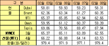 2월8일 58.31달러로 0.92달러 하락 … Brent유와 WTI도 하락세 두바이(Dubai)유 가격이 3일 연속 하락세를 이어갔다.한국석유공사에 따르면, 2월8일 거래된 중동산 두바이유 현물가격은 배럴당 58.31달러로 전날보다 0.92달러 하락했다. Brent유 현물가격도 배럴당 0.92달러 하락한 60.35달러를 형성했고, WTI(서부텍사스 중질유) 현물가격은 배럴당 0.28달러 하락한 62.66달러에 거래됐다. NYMEX(뉴욕상업거래소) WTI 선물유가는 배럴당 0.54달러 하락한 62.55달러, IPE(Dud국 국제석유거래소) Brent 선물유가는 배럴당 0.50달러 하락한 61.06달러에 거래가 종료됐다.