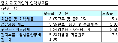 화합물 및 화학제품의 인력부족률이 3.05%, 고무 및 플래스틱제품 제조업이 5.4%, 섬유제품 제조업이 3.95%, 코크스ㆍ석유정제제품이 1.24%, 조립금속제품 제조업이 5.2%, 기타 기계 및 장비 제조업이 5.42%, 전자부품ㆍ영상ㆍ음향장비 제조업이 5.23% 등으로 조사됐다.