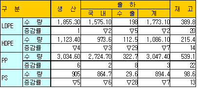 에틸렌 이외의 석유화학제품도 HDPE가 전년대비 4%, PS가 5%, PVC가 0.5% 감소한 것을 제외하면 모두 신장한 것으로 파악된다.