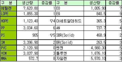 이밖에 PP, SM, EO, MMA, 벤젠(Benzene), 톨루엔(Toluene), 자일렌(Xylene)은 각각 과거 최고의 생산량을 기록한 것으로 나타났다.
