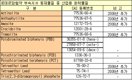 로테르담협약 개정으로 수출승인을 받아야 하는 화학물질은 64종에서 70종으로 늘어난다. 추가되는 품목은 2004년 9월 제1차 로테르담협약 당사국총회시 부속서Ⅲ에 추가등재가 결정된 갈석면, 악티놀라이트, 안소필라이트, 트레모라이트 등 석면 4종과 사에틸납, 사메틸납 등 총 6개 물질이다. 품목확대와 함께 기존에 한국화학물질관리협회에서만 담당하던 수출승인업무를 전국 7개 유역(지방)환경청이 수출승인업무를 수행하도록 확대했다. 고시개정으로 산업용 화학물질 6종이 추가되나, 석면류의 수출실적이 없었던 점을 감안한다면 국내 산업계와 관련된 물질은 사에틸납과 사메틸납 2개 물질에 불과해 실제 산업계에 미치는 영향은 미미할 것으로 전망된다. 한편, 사에틸납과 사메틸납은 독성이 강해 노출시 두통, 피로, 불면증, 설사 등이 발생하고, 중독시에는 과흥분성, 저혈압, 저체온, 서맥(徐脈), 환각, 혼수 등을 유발할 가능성이 있다. 표, 그래프: | 로테르담협약 부속서Ⅲ 등재물질 중 산업용 화학물질 | <화학저널 2006/02/14> |