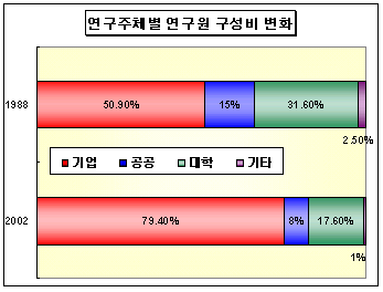 하지만 국내 기업부문의 연구원 구성비율이 1988년 50.9%에서 2002년 73.4% 로 크게 증가한 반면 공공부문은 15.0%에서 8.0%, 대학은 31.6%에서 17.6% 로 각각 축소되는 양극화 현상을 보인 것으로 나타났다.