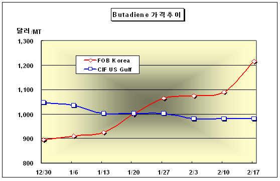 FOB Korea 1210-1220달러 형성 … 미국은 981달러로 보합세 유지 부타디엔(Butadiene) 가격은 2월17일 FOB Korea 톤당 1210-1220달러로 125달러 폭등했다.아시아 부타디엔 시장은 국제유가 약세에도 중국의 SBR(Styrene Butadiene Rubber) 수요강세 및 Shanghai Secco의 가동중단과 주요 플랜트의 정기보수 임박으로 순식간에 1200달러를 돌파했다. 국제유가는 2월15일 WTI(서부텍사스중질유) 선물가격이 배럴당 57.65달러로 전일대비 1.92달러, Dubai유 현물가격이 배럴당 55.69달러로 0.90달러 하락했다. Secco의 Caojing 소재 부타디엔 9만톤 플랜트는 2월17일 에틸렌 90만톤 크래커의 트러블과 함께 가동이 중단됐고 LG석유화학은 4월1일부터 5월30일까지 정기보수를 계획하고 있다. 일본 소재 5개 부타디엔 플랜트 역시 LG석유화학과 정기보수 시점이 겹쳐 수급타이트가 가중될 것으로 예상되며 롯데대산유화와 여천NCC는 3월 인도분 Cargo를 각각 FOB Korea 톤당 1220달러, 1210달러에 판매한 것으로 나타났다. CFR China 가격은 톤당 1210-1220달러, CFR SE Asia 가격은 톤당 1190-1200달러에 마감됐다.