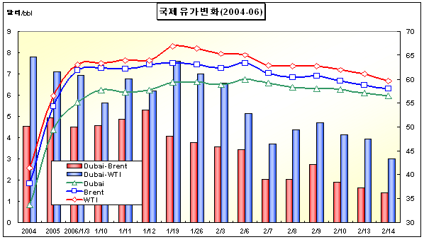 2004년 7.09달러에서 2006년 2월 2.98달러로 … Brent와는 1.40달러 두바이(Dubai)유 현물가격이 Brent유 및 WTI와의 차이가 계속 줄어들고 있는 것으로 나타났다.특히, 두바이유와 WTI의 차이는 2006년 2월14일 기준 2.98달러까지 줄어들어 2004년 7.79달러와 큰 폭의 차이를 보였다. 두바이유와 Brent유는 2004년 배럴당 4.54달러의 차이를 나타냈으나 2005년 4.93달러, 2006년 1월 4.52달러, 2006년 2월14일 1.40달러의 차이를 나타내 차이가 현저하게 줄어들고 있는 것으로 나타났다.