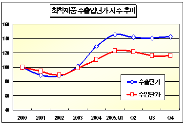 경공업제품은 금, 고무타이어 및 튜브, 직물 등이 올라 6.8% 상승했다. 화학제품 수출단가는 2000년을 100으로 설정했을 때 2001년에는 11.5% 하락한 88.5, 2002년 0.6% 하락한 88.0으로 다소 하락했으나 2003년 14.5% 상승한 100.8을 기록하며 상승세에 접어들어 2004년 27.7% 상승한 128.7, 2005년 10.7% 상승한 142.5를 기록했다. 고무타이어 및 튜브의 수출단가는 2002년에는 0.5% 하락한 99.5, 2002년 2.5% 상승한 102.0, 2003년 9.2% 상승한 111.4, 2004년 10.5% 상승한 123.1, 2005년 8.9% 상승한 134.0을 기록했다. 이에 따라 전체 품목의 2005년 수출단가는 2001년 85.9를 기록했고 2002년에는 83.1, 2003년 85.1, 2004년 91.5, 2005년 93.0을 기록했다. 2005년 수입단가는 원유, 철강재, 비철금속 등이 크게 올라 9.4% 상승했다. 특히, 원유의 수입단가는 39.8%, 철강재는 17.3%, 비철금속은 11.9% 상승했다. 화학제품은 2000년 수입단가를 100으로 설정했을때 2001년 6.1% 하락한 93.9, 2002년 5.5% 하락한 88.7를 기록하며 하락세를 이어갔으나 2003년 11.3% 상승한 98.7을 기록하며 상승세에 접어들었다. 2004년에는 11.9% 상승한 110.4, 2005년 7.6% 상승한 118.8을 기록했다. 표, 그래프: | 화학제품 수출입단가 지수추이 | <화학저널 2006/02/20> |