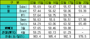 2월20일 57.06달러로 1.49달러 상승 … Brent유도 1.33달러 급등 두바이(Dubai)유 가격이 급등했다.한국석유공사에 따르면, 2월20일 거래된 중동산 두바이유 현물가격은 배럴당 57.06달러로 전날보다 1.49달러 올랐다. Brent유 현물가격도 배럴당 1.33달러 상승한 59.39달러를 형성했다. NYMEX(뉴욕상업거래소) 선물시장은 미국 대통령의 날(Presidents' day) 연휴로 휴장했으며, IPE(영국 국제석유거래소) Brent 선물유가는 배럴당 1.64달러 상승한 61.53달러에 거래가 종료됐다.