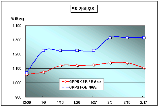 CFR FE Asia 1100-1110달러로 35달러 하락 … ABS는 55달러 급락 GPPS(General Purpose Polystyrene) 가격은 2월15일 CFR FE Asia 톤당 1100-1110달러로 35달러 하락했다.아시아 PS 시장은 국제유가 약세 및 업스트림인 벤젠(Benzene)과 SM(Styrene Monomer) 가격하락으로 고전을 면치 못했다. 국제유가는 2월15일 WTI(서부텍사스중질유) 선물가격이 배럴당 57.65달러로 전일대비 1.92달러, Dubai유 현물가격이 배럴당 55.69달러로 0.90달러 하락했다. 벤젠 가격은 2월17일 FOB Korea 톤당 730-740달러로 63달러, SM 가격은 FOB Korea 톤당 995-1015달러로 30달러 하락했다. 게다가 중국 소비재 부문의 PS/ABS(Acrylonitrile Butadiene Styrene) 수요가 춘절 연휴 이후에도 회복되지 않아 가격하락을 견인하고 있는 것으로 나타났다. HIPS(High-Impact PS) 가격은 CFR FE Asia 톤당 1150-1160달러로 35달러 하락했고 ABS 가격은 CFR FE Asia 톤당 1370-1380달러로 55달러 급락했다.