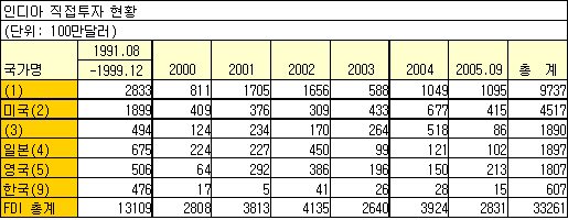 인디아 직접투자 유입액은 2004년 400만달러로 중국 600만달러, 러시아 1200만달러에 비해 현저히 낮은 수준이며, 증가율 측면에서도 러시아 324.7%, 중국 29.3%에 비해 낮은 2.9%를 기록했다.