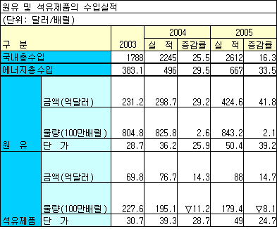 한은, 국제유가 급등에 수입량 급증 … 1월 43억달러로 96.2% 급증 정유기업들이 수입부과금 인상을 앞두고 원유 수입을 늘리면서 2006년 1월 원유 도입액이 사상 최고치를 기록했다.2월23일 한국은행과 산업자원부에 따르면, 2006년 1월 원유 수입액은 43억4000만달러로 2005년 1월에 비해 96.2% 급증했다.