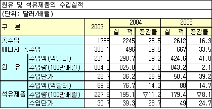 산자부, 2004년 대비 41.8% 급등 … 석유제품도 49.0달러로 상승 2005년 에너지 수입액이 667억달러에 달해 2004년보다 33.5% 증가했다.그러나 수입량은 2억2790만TOE(석유환산톤)로 0.6% 늘어나는데 그쳤다. 산업자원부에 따르면, 2005년 에너지 수입액은 전체 수입액(2612억달러)의 25.5%에 달해 2003년 21.4%, 2004년 22.1%에 이어 3년 연속 전체 수입액에서 차지하는 비중이 높아졌다. 2005년 에너지 수입액은 수출 300억달러의 1위 반도체와 295억달러를 기록해 2위인 자동차의 합계액보다 많은 금액이다.