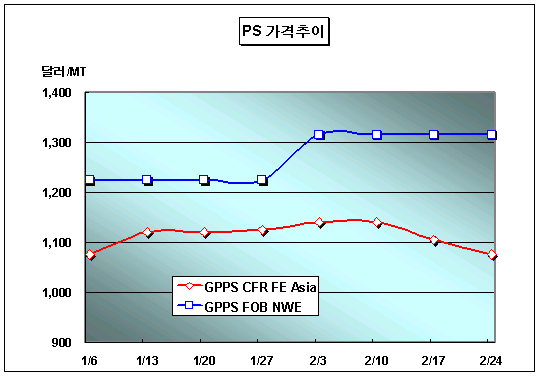 CFR FE Asia 1070-1080달러로 30달러 하락 … 채산성 악화로 적자 GPPS(General Purpose Polystyrene) 가격은 2월22일 CFR FE Asia 톤당 1070-1080달러로 30달러 하락했다.아시아 PS 시장은 업스트림인 벤젠(Benzene)과 SM(Styrene Monomer) 가격하락에 중국수요 부진으로 톤당 1100달러대를 지키지 못했다. 벤젠 가격은 2월24일 FOB Korea 톤당 725-730달러로 7달러, SM 가격은 FOB Korea 톤당 985-995달러로 15달러 하락했다. 중국에서는 최종 소비재 부문의 수요가 춘절 연휴 이후에도 회복되지 않아 PS 재고가 증가하고 있으며 중국, 타이완, 한국 PS 플랜트의 가동률은 60-80%에 그치고 있는 것으로 알려졌. GPPS의 채산성은 갈수록 심각해지고 있는데 CFR China 톤당 1010-1020달러를 형성한 SM과의 가격스프레드가 60달러에 불과한 것으로 나타났다. HIPS(High-Impact PS) 가격은 CFR FE Asia 톤당 1120-1130달러로 30달러 하락했고 ABS 가격은 CFR FE Asia 톤당 1360-1370달러로 10달러 하락했다.