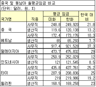 국내와 비교한 생산직 근로자의 임금수준은 말레이지아가 29% 수준으로 가장 높았고, 타이가 25%, 필리핀이 23%, 중국이 13.2% 순으로 나타났다. 월평균 임금은 말레이지아가 47.5만원으로 한국 노동력 대비 29%, 타이가 20.8만원으로 25%, 필리핀이 16.9만원으로 23%, 중국이 12만원으로 13.2% 수준이었다. 그러나 현지 진출기업들은 임금의 상승속도가 한국보다 빠른 것으로 인식하고 있는 것으로 나타났다. 한국보다 현지의 임금상승 속도가 빠르다고 응답한 비율은 중국 진출기업들이 63%, 동남아 진출기업들이 42%로 나타났다. 기본급보다 추가인건비 부담이 크다고 응답한 비율은 중국 진출기업들이 42%, 동남아 진출기업들이 27%로 나타났으며, 예상임금을 과소평가 했다는 응답은 중국 진출기업들이 55%, 동남아 진출기업들이 39%로 나타났다. 한편, 현지 진출기업들은 임금관리와 관련된 애로사항으로 과다한 추가인건비와 높은 임금상승률을 꼽았다. 중국 진출기업은 과다한 추가 인건비라고 응답한 비중이 39.6%로 가장 높았으며, 높은 임금상승률이 22.8%, 기업간 임금인상 경쟁이 12.9% 순으로 나타났다. 동남아 진출기업은 높은 임금상승률이 25.7%, 임금수준에 대한 부담감이 18.1%, 과다한 추가인건비가 12.5%로 나타났다. 보고서는 “앞으로 중국은 비롯한 해외시장투자는 저임금을 활용해 저부가가치 제품을 생산해 해외로 수출하는 유형보다는 현지 내수시장을 겨냥해 고부가제품을 공급하는 투자전략을 선택하는 것이 바람직할 것”이라고 지적했다. 표, 그래프: | 중국 및 동남아 월평균임금 비교 | <화학저널 2006/02/28> |