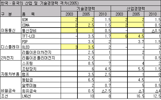 산자부, 디스플레이 기술경쟁력 3-4년 … 리튬이온 2차전지는 2.5년 중국의 추격이 거세지면서 디스플레이, 2차전지 등 주요 전자산업의 기술경쟁력 격차가 2005년에 1-3년 정도로 좁혀진 것으로 분석됐다.산업자원부가 발표한 <중국산업 및 기술경쟁력 분석과 대응방안>에 따르면, 8개 산업, 20개 품목의 한ㆍ중 산업 및 기술경쟁력 격차에 관한 분석결과, TFT-LCD, PDP 등 디스플레이의 기술경쟁력 격차는 2005년에 3.5년이었으나 2010년에는 2년 정도로 좁혀지고 산업경쟁력 격차는 2010년에 1-2년으로 좁혀질 것으로 전망됐다. 중국정부는 디스플레이 산업을 국가발전의 전략산업으로 선정해 일본기업과의 합작과 한국기업의 인수를 통한 성장전략을 추구하고 있다.