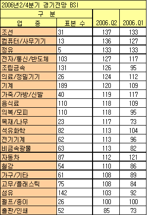 대한상의, BSI 113으로 9p 상승 … 고무ㆍ플래스틱은 무려 28p 상승 최근 소비와 생산 등 실물경기가 호조를 보이고 있는 가운데 석유화학을 포함한 제조기업들의 경기회복 기대감이 커지고 있는 것으로 나타났다.대한상공회의소(회장 손경식)에 따르면, 2일 전국 1485사의 제조기업을 대상으로 <2006년 2/4분기 기업경기전망>을 조사한 결과, 2/4분기 BSI(기업경기실사지수) 전망치가 기준치를 대폭 상회하는 116으로 집계됐다.