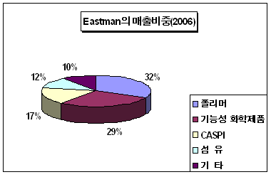 Banc of American Securities는 Eastman의 2005년 매출이 71억달러로 7% 증가했고 주당수익이 주당 5.93달러로 2배 신장한 것을 긍정적으로 평가해 투자의견으로 비중확대(Overweight)를 제시했지만 북미 PET 생산능력 확대와 PET 수입제품과의 경쟁심화, 에너지 및 원료코스트 강세는 악재가 될 것으로 평가하고 있다. 표, 그래프: | Eastman의 매출비중(2006) | <화학저널 2006/03/06> |