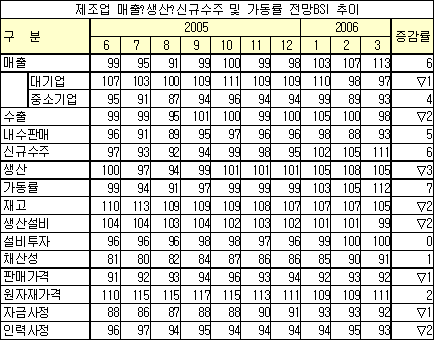 이에 비해 3월 업황전망 BSI는 95로 3p 상승해 2006년 1월 이후 3개월 연속 상승세를 나타냈으나 기준점인 100에는 미치지 못했다. 사무기기는 84에서 108로 24p, 음식료폼은 90에서 96으로 6p 상승한 반면, 화합ㆍ화학은 101에서 89로 12p, 섬유는 78에서 69로 9p 하락할 것으로 예상됐다. 매출실적 BSI와 가동률 BSI가 모두 기준치인 100으로 각각 2p와 1p 하락했으나 제품재고수준 BSI는 108로 1p 상승했다. 또 채산성 BSI는 85로 1월과 같았으며, 자금사정 BSI는 5p 낮아진 88에 그쳤다. 비제조업도 2월 업황 BSI는 83으로 4p 하락했으나 3월 전망 BSI는 4p 상승한 93으로 경기비관론이 다소 완화된 것으로 조사됐다. 한편, 조사대상 제조기업의 23.9%는 환율하락을 가장 큰 경영애로 사항으로 꼽았으며 19.7%가 내수부진을, 13.0%가 원자재가격 상승을, 10.4%가 경쟁심화를 꼽았다. 한국은행 관계자는 “2006년에는 설연휴가 1월에 있어 2월의 플러스 요인이 없어졌고 환율 하락에 따른 부정적인 효과도 발생했다”며 “업황 BSI 하락을 두고 실제 경기가 나빠졌다고 단언하는 것은 무리가 있다”고 강조했다. <김지은 기자> 표, 그래프: | 제조업 매출ㆍ생산ㆍ신규수주 및 가동률 전망BSI 추이 | <화학저널 2006/03/06> |