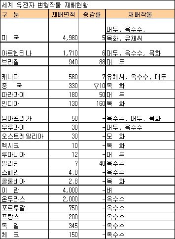 ISAAA, 21개국 9000만ha로 11% 증가 … 브라질ㆍ인디아 급격히 증가 2005년 세계 유전자 변형작물(GMO)의 재배면적이 9000만ha로 2004년에 비해 11% 증가했다.국제 Agri-Biotech(ISAAA)의 회장 겸 창시자인 Clive James 박사가 발표한 보고서에 따르면, 유전자 변형작물 재배가 6개국으로 처음 상업화됐던 1996년에는 재배면적이 170만ha에 불과했으나 약 10년만에 50배 이상 확대된 것으로 나타났다.