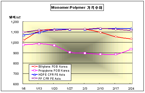 한편, 프로필렌 신규설비 가동에 들어간 아시아 생산기업들은 대한유화를 비롯해 일본 2사가 있다. 대한유화의 온산 소재 Methathesis 프로세스 OCU 프로필렌 11만톤 플랜트는 2005년 12월14일, 일본 Nippon Petrochemicals의 Kawasaki OCU 15만톤 플랜트는 2006년 1월말 상업가동에 돌입했으며 Mitsubishi Chemical의 OCU 6만톤 플랜트는 3월 가동을 예정하고 있다. 표, 그래프: | Monomer/Polymer 가격추이 | <화학저널 2006/03/07> |