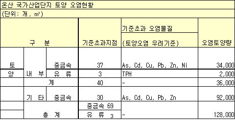 환경부, 토양오염 우려기준 6.3% 초과 … 지하수는 7.4%가 기준초과 온산국가산업단지의 일부 토양이 중금속으로 오염돼 토양오염 우려기준을 초과하고 있는 것으로 나타났다.특히, 아연 등 비철금속을 제조하는 배출업소 부지의 비소(As) 오염도가 토양오염우려기준인 kg당 20㎎보다 최고 35배인 703㎎까지 높았으며, 원광석을 온산항에서 제조기업으로 이송할 때 사용하는 도로주변에서도 비소가 우려기준보다 최고 8배인 166㎎으로 높게 오염된 것으로 조사됐다.