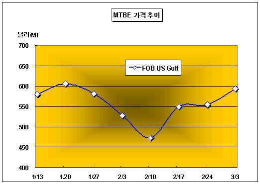 FOB Singapore 550-560달러로 올라 … 미국은 39달러 상승 MTBE 가격은 3월3일 FOB Singapore 톤당 550-560달러로 10달러 상승했다.아시아 MTBE(Methyl Tertiary Butyl Ether) 시장은 국제유가 및 휘발유 가격급등에 공급기업들의 판매 유보가 겹치면서 상승세를 이어갔다. 국제유가는 3월3일 WTI(서부텍사스중질유) 선물가격이 배럴당 63.67달러로 전일대비 0.31달러, Dubai유 현물가격이 배럴당 59.90달러로 1.14달러 급등했다. 싱가폴 휘발유 가격은 3월2일 옥탄가(RON) 97 제품이 배럴당 70.24달러로 1.23달러, 옥탄가 95 제품이 배럴당 67.95달러로 1.32달러, 옥탄가 92 제품이 배럴당 67.20달러로 1.00달러 급등한 것으로 알려졌다. 타이 BST의 Map Ta Phut 소재 MTBE 5만3000톤 플랜트는 2005년 11월18일부터 12월9일까지 진행된 정기보수 이후 Crude C4 조달에 문제가 생겨 가동률 80%를 줄곧 유지하고 있으며 1/4분기까지 Spot Cargo를 출하하지 않을 방침이다. 말레이지아 Petronas의 MTBE 30만톤 플랜트는 4월초 정기안전점검을 위해 3일간 가동을 중단할 예정이다.