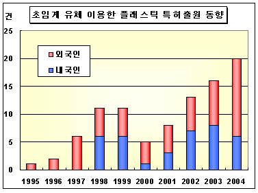 특허청, 초임계 유체 이용해 무해 … 특허출원도 늘어 친환경 반영 최근 웰빙열풍에 발맞추어 플래스틱산업에서 초임계 유체를 이용한 무공해 기술개발이 활발히 진행되고 있다.초임계 유체란 액체 또는 기체 물질의 온도와 압력을 임계값 이상으로 높여 얻어지는 물질로서, 플래스틱을 쉽게 용해시킬 수 있고 기체처럼 자유로운 흐름성을 가지는 성질을 이용해 플래스틱 산업에서 인체 및 환경에 무해한 용매로 사용된다. 특허청에 따르면, 초임계 유체를 이용한 플래스틱 특허출원은 1995년 이전에는 3-4건으로 미미한 수준이었고, 1996-2001년에는 8-11건 정도였으며, 2002-2004년에는 13-20건으로 증가하는 추세를 보이고 있다.