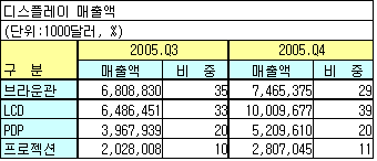 2005년 4/4분기 매출 100억달러 넘어 1위 … PDP는 74억원 3위 월드컵 특수와 가격 하락에 따른 수요 확대 등에 힘입어 LCD TV의 2005년 4/4분기 매출이 사상 처음으로 100억달러를 넘어서면서 브라운관 TV를 누르고 최대의 디스플레이로 등극했다.디스플레이서치에 따르면, 2005년 4/4분기 LCD TV의 매출액은 100억967만7000달러를 기록해 3/4분기 64억8645만1000달러보다 무려 54.3% 늘어나면서 처음으로 브라운관 TV를 앞질렀다.