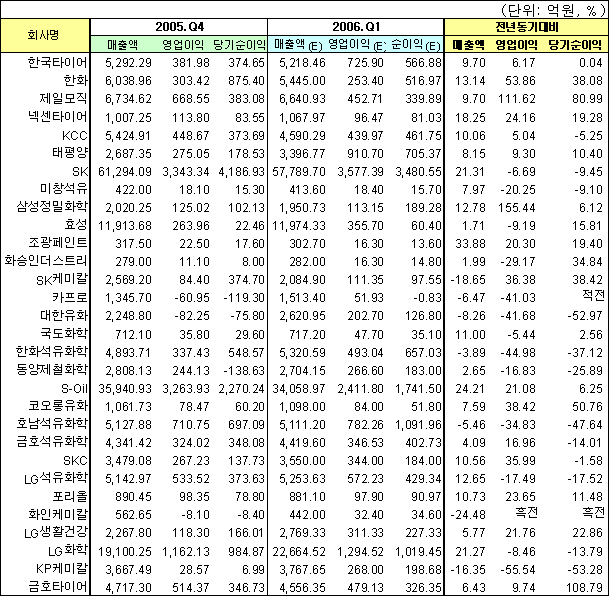 SKㆍLG화학 매출 21% 증가 … 호남석유화학은 영업이익 34% 감소 12월 결산 상장기업들의 2006년 1/4분기 실적이 기업별로 격차가 뚜렷한 것으로 나타났다.금융정보기업인 에프앤가이드에 따르면, 증권기업들이 실적 추정치를 제시하고 있는 192개 유가증권시장 상장기업들의 2006년 1/4분기 매출액과 영업이익은 148조4246억원과 15조4888억원으로 전년동기대비 각각 12.32%, 15.78% 늘어날 것으로 예상됐다. 2005년 4/4분기 실적 추정치와 비교하면 매출액은 3.15% 줄어들지만 영업이익은 7.23% 늘어날 것으로 전망됐다.