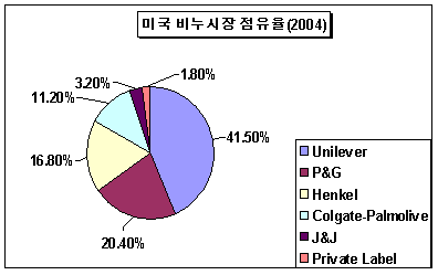 다만, 미국 욕실용품 매출은 2005년 24억달러에서 2010년 22억달러로 다소 감소할 것으로 전망돼 장기적인 판매전략 개발이 필요한 것으로 지적되고 있다. 한편, 미국 비누시장은 Unilever와 P&G(Proctor & Gamble)가 주도하고 있으며 2004년 29억달러에 Dial을 인수한 독일 Henkel이 3위로 부상해 각축전을 벌이고 있다. 표, 그래프: | 미국 비누시장 점유율(2004) | <화학저널 2006/03/21> |