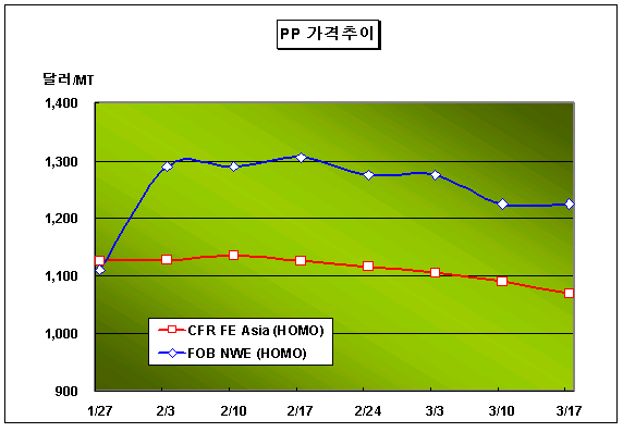 CFR FE Asia 1065-1075달러 형성 … 중국 재고감소에 기대 PP 가격은 Raffia/Injection 기준 3월15일 CFR FE Asia 톤당 1065-1075달러로 20달러 하락했다.아시아 PP(Polypropylene) 시장은 업스트림인 프로필렌(Propylene) 가격하락과 중국의 수요 부진으로 고전을 면치 못했다. 프로필렌 가격은 3월17일 FOB Korea 톤당 900-910달러로 15달러 하락했고 PP IPP Flim 그레이드는 CFR FE Asia 톤당 1090-1100달러, Block Copolymer 그레이드는 톤당 1100-1110달러를 형성했다. 그러나 중국의 PP 재고율이 하락하고 있어 수요기업들의 Spot 구매가 증가할 것으로 예상되며 내수가격은 Raffia/Injection 기준 ex-Works 톤당 1만900-1만1000위안으로 200위안 폭등한 것으로 나타났다. 특히, 중국 ZRCC(Zhenhai Refining & Chemical)의 Ningbo 소재 PP 20만톤 플랜트는 잇단 트러블로 공급차질이 심각한 것으로 알려졌다. ZRCC의 PP 플랜트는 3월8일 기술적인 문제로 가동중단된 이후 3월14일 가동재개됐으나 3월16일 다시 트러블을 일으킨 이후 3월17-18일 재가동에 들어간 것으로 파악되고 있다. 동남아 시장은 Raffia/Injection 그레이드가 CFR SE Asia 톤당 1070-1075달러, IPP Film 그레이드가 톤당 1095-1100달러, Block Copolymer 그레이드가 톤당 1105-1110달러에 마감됐다.