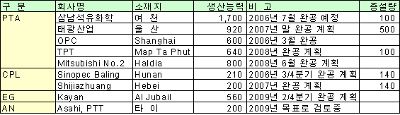 Sinopec Baling Yingshan Petrochemical은 2006년 3/4분기까지 CPL 생산능력을 7만톤에서 21만톤으로 14만톤, Shijiazhuang Chemical Fiber 역시 2007년까지 생산능력을 6만톤에서 20만톤으로 14만톤 확대할 계획으로 파악되고 있다. 표, 그래프: | 아시아의 합섬원료 신증설 프로젝트(2006) | <화학저널 2006/03/21> |