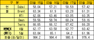 3월20일 57.42달러로 1.17달러 하락 … Brent유와 WTI도 폭락 두바이(Dubai)유 가격이 급락했다.한국석유공사에 따르면, 3월20일 거래된 중동산 두바이유 현물가격은 배럴당 57.42달러로 전날보다 1.17달러 하락했다. Brent유 현물가격도 배럴당 1.97달러 하락한 61.31달러를 형성했고, WTI(서부텍사스 중질유) 현물가격은 배럴당 2.70달러 폭락한 60.35달러에 거래됐다. NYMEX(뉴욕상업거래소) WTI 선물유가는 배럴당 2.35달러 하락한 60.42달러, IPE(영국 국제석유거래소) Brent 선물유가는 배럴당 1.92달러 하락한 61.34달러에 거래가 종료됐다.
