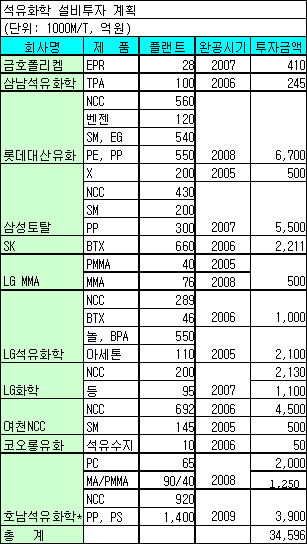 호남석유화학이 2009년까지 나프타분해시설 등에 7150억원을 투자하는 것을 비롯해 롯데대산유화가 2008년까지 6700억원, 삼성토탈이 2007년까지 5500억원, LG화학이 2007년까지 3230억원 등의 투자를 할 예정이다. 석유화학산업계는 충남 대산단지 진입도로 확장 등 인프라 구축지원 등을 건의하고 경쟁력 제고를 위해 현재 각 기업이 추진하고 있는 구조조정, 에너지 및 원가 절감과 컴비나트 프로젝트(CT Project)를 추진해 울산, 여수 및 대산 단지별 정유ㆍ석유화학사간 연계 강화를 통한 석유화학단지의 효율적 생산체제를 구축할 수 있도록 정부에 지원을 요청했다. 또 석유화학업계는 향후 기술협력대상을 영세 플래스틱기업까지 확대하는 한편 수급기업간 협력위원회(가칭)를 구성해 기술협력 강화, 공동인력 개발, 소재 수요창출 등 공동 협력사업을 플래스틱산업계와 실천과제를 마련해 추진할 계획이다. 표, 그래프: | 석유화학 설비투자 계획 | <화학저널 2006/03/24> |