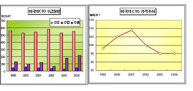 CTO 수출은 1999-2002년 평균 수출량보다 60% 신장한 2003년부터 크게 증가하기 시작해 2004년에는 전년대비 30%, 2005년에는 25% 증가했다. CTO 수출의 60%는 스웨덴과 영국이 차지하고 있으며 핀란드 및 노르웨이 수출량도 큰 것으로 알려졌다. 유례없는 고유가에 따라 일부 펄프 메이커들은 CTO를 대체연료로 사용하고 있으며 C18 Oleic 지방산 등 식물성 지방산 가격상승으로 CTO 지방산 매출도 신장하고 있는 것으로 나타났다. 식물성 지방산 중 아마인유(Linseed Oil)는 2004년 캐나다 및 North Dacota의 아마씨 작황부진으로 2005년 4월 이후 50% 급등해 10월 파운드당 75센트를 형성했다. 미국의 CTO 수요는 1999-2004년 연평균 0.5% 감소했으나 2008년까지 연평균 0.5% 신장할 것으로 예상되나, CTO 수출증가, 대체연료 사용 활성화, 톨유지방산 호조가 지속되면 CTO 가격상승으로 이어져 자칫 시장 성장에 부정적인 요인이 될 것으로 판단된다. 한편, 톨유(Tall Oil)는 소나무 Chip을 원료로 Kraft 펄프를 제조할 때 목재에서 용출된 흑액에서 농축된 톨유비누(Tall Oil Soap)를 분리한 후 다시 황산 처리해 생산하며 톨유를 증류해 톨유지방산(TOFA), Rosin, 피치(Pitch) 등을 분리한다. 표, 그래프: | 미국의 CTO 수급동향 | 미국의 CTO 가격추이 | <화학저널 2006/03/28> |