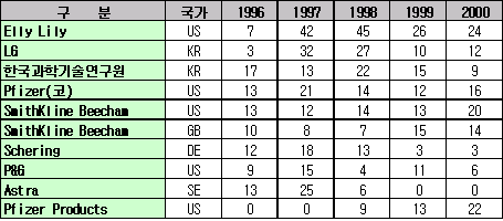 특허청, BayerㆍBASFㆍPfizer 상위권 차지 … 내국인 40% 미만 의약품 발명의 대표적인 분야인 의약품 제제 및 복소환식 화합물 발명에서 외국인의 특허 출원이 앞서고 있는 것으로 나타났다.특허청에 따르면, 내국인 출원비율은 1997년 29.5%에서 2003년 35.4%로 점차 증가하는 추세이며 2001년 39.5%로 최고점을 기록했다.