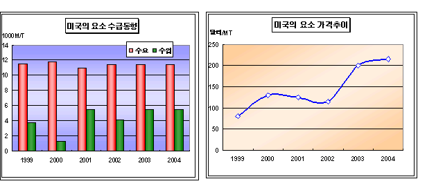 미국, 2001년 이후 플랜트 폐쇄 잇따라 … 2005년 수요 1159만톤 미국의 요소(Urea) 생산능력은 2004년 774만톤에 달했다.미국의 요소 수요는 2003년 1139만톤에서 2004년 1136만톤으로 감소했고 2005년에도 1159만톤에 그친 것으로 추정되며, 수입은 2003년 547만톤에서 2004년 542만8000톤으로 감소했고 수출은 연간 40만톤에 불과하다. Spot가격은 1999-2004년 Bulk 기준 톤당 최고 267달러, 최저 75달러를 기록했고 최근에는 톤당 260달러를 형성했다.