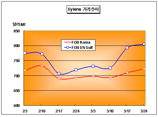 FOB Korea 720-725달러로 13달러 올라 … 미국도 11달러 상승 자일렌(Xylene) 가격은 3월24일 Solvent 그레이드 기준 FOB Korea 톤당 720-725달러로 13달러 상승했다.아시아 자일렌 시장은 국제유가 강세와 미국시장 호조 및 수급타이트로 3월17일 반등에 성공한 후 상승세를 이어갔다. 국제유가는 3월24일 WTI(서부텍사스중질유) 선물가격이 배럴당 64.26달러로 전일대비 0.35달러, Dubai유 현물가격은 배럴당 57.53달러로 0.96달러 상승했다. LG석유화학은 4월 예정된 벤젠(Benzene) 20만톤, 톨루엔(Toluene) 9만톤, 자일렌 5만톤 생산설비의 정기보수에 따라 4월 인도분 Cargo 출하를 자제하고 있으며 여천NCC는 3월 5주부터 Cargo를 출하할 방침으로 알려졌다. Isomer 그레이드 가격은 FOB Korea 톤당 760-765달러, 중국 내수가격은 동부지방이 ex-Tank 톤당 7200위안을 형성했다. CFR Taiwan/SE Asia 가격은 Solvent 그레이드가 톤당 745-755달러, Isomer 그레이드가 톤당 785-790달러에 마감됐다.