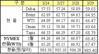 3월29일 59.03달러로 0.94달러 급등 … Brent유와 WTI도 상승 두바이(Dubai)유 가격이 상승했다.한국석유공사에 따르면, 3월29일 거래된 중동산 두바이유 현물가격은 배럴당 59.03달러로 전날보다 0.94달러 상승했다. Brent유 현물가격도 배럴당 0.32달러 상승한 64.95달러를 형성했고, WTI(서부텍사스 중질유) 현물가격은 배럴당 0.58달러 상승한 65.55달러에 거래됐다. NYMEX(뉴욕상업거래소) WTI 선물유가는 배럴당 0.38달러 상승한 66.45달러, IPE(영국 국제석유거래소) Brent 선물유가는 배럴당 0.58달러 상승한 65.55달러에 거래가 종료됐다.