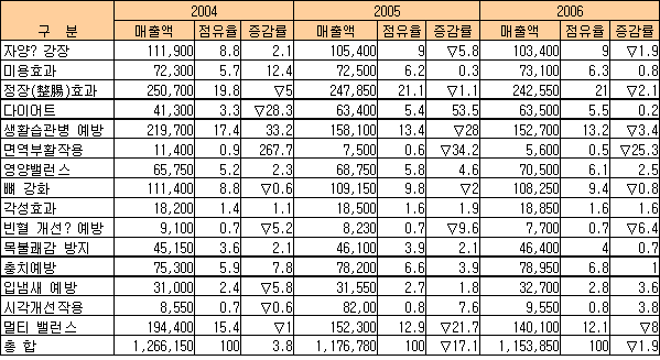롯데나 Meiji제과 등의 시장점유율은 높은 편이며 미개척 여성층까지 파고든다는 의욕을 보이고 있어 2005년 시장규모는 3.9% 증가한 782억엔, 2006년에는 1% 증가한 790억엔으로 예상된다. 이외에도 자양ㆍ강장, 생활습관병 예방, 빈혈 개선ㆍ예방 등을 위한 제품이 꾸준히 호조를 보이고 있다. 일본의 건강식품 시장규모는 2005년 1조1768억엔으로 7.1% 감소해 1997년 이후 꾸준히 확대됐으나 서서히 축소될 것으로 전망된다. 2006년에는 1조1539억엔으로 1.9% 감소해 주춤할 것으로 보이나 충치예방식품 등 효능에 따라서는 크게 신장하는 분야도 나올 것으로 예상된다. 표, 그래프: | 건강지향식품의 시장규모추이 | <화학저널 2006/04/04> |