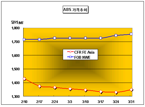 CFR FE Asia 1340-1360달러 형성 … 유럽은 1755달러로 10달러 상승 ABS 가격은 3월29일 CFR FE Asia 톤당 1340-1360달러로 20달러 상승했다.아시아 ABS(Acrylonitrile Butadiene Styrene) 시장은 업스트림인 벤젠(Benzene) 및 SM(Styrene Monomer) 가격상승과 중국수요 회복으로 반등에 성공했다. 벤젠 가격은 3월31일 FOB Korea 톤당 730-735달러, SM 가격은 FOB Korea 톤당 985-990달러로 각각 13달러, 35달러 상승했다. 그러나 벤젠과 SM을 비롯해 부타디엔(Butadiene)이 FOB Korea 톤당 1245달러, AN(Acrylonitrile)이 CFR China 톤당 1410달러로 강세를 보이고 있어 ABS 마진은 톤당 50달러 수준에 그쳐 고전을 면치 못하고 있는 것으로 알려졌다.