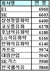 SK, 2005년 평균 6603만원에 호남 6180만원 … 30위안에 11사 포함돼 2005년 상장기업 가운데 화학ㆍ에너지기업이 많은 연봉을 받은 것으로 조사됐다.산업별로는 지주회사와 은행, 화학ㆍ에너지, 건설업 종사자들의 급여가 많았으며 10대그룹 가운데는 SK와 현대중공업, 삼성, GS, LG 순으로 평균 연봉이 많았다. 반면, 2004년 연봉 1위였던 삼성전자는 성과급이 급감하면서 직원 평균 급여가 30% 가까이 줄어 연봉 순위도 80위로 추락했다.