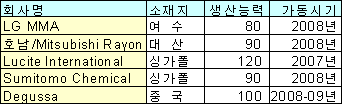 Mitsubishi Rayon은 아시아 최대의 MMA 메이저로 일본 Otaka 플랜트와 타이 Map Ta Phut 소재 Siam Cement와의 합작 플랜트를 운영하고 있다. 최근에는 중국 Daya Bay 소재 MMA 9만톤 플랜트를 완공했으며 2009년 말까지 미국 텍사스 소재 14만톤 플랜트를 건설할 계획으로 알려졌다. Lucite International은 중국 Caojing 소재 MMA 10만톤 플랜트를 완공했으며 2007년 싱가폴 소재 12만톤 플랜트의 가동을 목표로 하고 있다. Sumitomo Chemical은 싱가폴 No.1 5만3000톤, No.2 8만톤 플랜트에 이어 No.3 9만톤 플랜트의 착공에 들어갔으며 Degussa는 중국 소재 10만톤 플랜트 신설 방침을 세우고 부지선정에 나선 것으로 알려졌다. 표, 그래프: | 아시아의 MMA 신설 프로젝트(2006) | <화학저널 2006/04/05> |