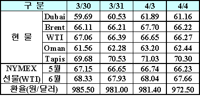 4월4일 61.16달러로 0.73달러 하락 … Brent유ㆍWTI도 내려 두바이(Dubai)유 가격이 다소 하락했다.한국석유공사에 따르면, 4월4일 거래된 중동산 두바이유 현물가격은 배럴당 61.16달러로 전날보다 0.73달러 하락했다. Brent유 현물가격도 배럴당 1.48달러 하락한 66.22달러를 형성했고, WTI(서부텍사스 중질유) 현물가격은 배럴당 0.38달러 하락한 66.27달러에 거래됐다. NYMEX(뉴욕상업거래소) WTI 선물유가는 배럴당 0.51달러 하락한 66.23달러, IPE(엉국 국제석유거래소) Brent 선물유가는 배럴당 0.45달러 하락한 66.39달러에 거래가 종료됐다.