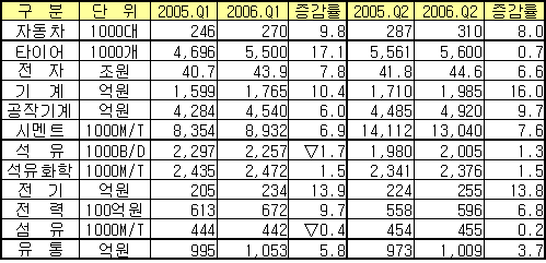 섬유부문은 2005년과 유사한 추이를 이어갈 것으로 예상된다. 2005년 1/4분기에 44만4000톤에 달했던 내수가 2006년 1/4분기에는 44만2000톤으로 0.4% 감소한 반면, 2005년 2/4분기에 45만4000톤이었던 내수가 2006년 2/4분기에는 45만5000톤으로 0.2% 신장할 전망이다. 표, 그래프: | 주요 산업의 내수동향 | <화학저널 2006/04/06> |