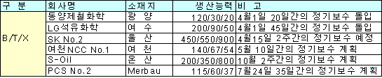 LGㆍ동양 4월1일 돌입 … TDP 가동률 감축 지속 국내 주요 BTX 플랜트의 정기보수가 4월 봇물을 이루고 있다.LG석유화학의 여수 소재 BTX 플랜트와 동양제철화학의 광양 소재 플랜트는 4월1일 각각 45일간, 20일간의 정기보수에 돌입했으며 LG석유화학은 벤젠(Benzene) 20만톤, 톨루엔(Toluene) 9만톤, Solvent 그레이드 자일렌(Xylene) 5만톤 플랜트의 생산능력을 각각 10%씩 증설할 것으로 알려졌다. SK의 울산 소재 No.2 Reformer 또한 4월15일부터 2주간의 정기보수에 돌입할 계획이며 벤젠 7만톤, 톨루엔 27만톤, 자일렌 32만톤의 신규 No.4 Reformer는 5월 가동에 들어갈 예정이다. KP케미칼은 No.1 벤젠 3만톤, 톨루엔 5만톤, O-X(Ortho-Xylene) 6만톤 플랜트와 No.2 벤젠 7만톤, 톨루엔 1만2000톤, O-X 16만톤 플랜트의 정기보수를 9월 하순 15-20일간 계획하고 있는 것으로 나타났다.