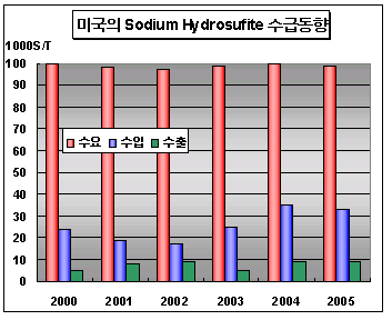 미국, 2009년 수요 10만S톤 그쳐 … 펄프표백용 신규수요 미미 미국의 Sodium Hydrosulfite 생산능력은 2005년 11만5000S톤(Short Ton)에 달했다.미국의 Sodium Hydrosulfite 수요는 2004년 10만S톤에서 2005년 9만9000S톤으로 감소했으며 2009년 10만S톤에 그칠 것으로 예상된다. 수입은 2004년 3만5300S톤에서 2005년 3만3500S톤으로, 수출은 2004년 8300S톤에서 2005년 7900S톤으로 감소했다. 리스트가격(List Price)은 2000-2005년 파운드당 0.74달러를 기록했고 2006년 1월1일 파운드당 0.80달러로 인상됐다.