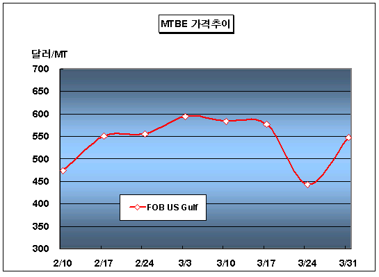 FOB Singapore 569-571달러 … 미국은 547달러로 104달러 폭등 MTBE 가격은 3월31일 FOB Singapore 톤당 569-571달러로 32.5달러 하락했다.아시아 MTBE(Methyl Tertiary Butyl Ether) 시장은 국제유가 강세에도 불구하고 공급과잉으로 돌아서면서 하락세를 면치 못했다. 국제유가는 3월31일 WTI(서부텍사스중질유) 선물가격이 배럴당 66.65달러로 전일대비 0.50달러 하락했고 Dubai유 현물가격은 배럴당 60.53달러로 0.84달러 상승했다. 중동 공급기업들의 Spot Cargo 유입은 계속 증가하고 있으며 3월 5주에만 4월 하순 인도분 2000톤 Cargo가 FOB Singapore 톤당 570달러, 또다른 2000톤 Cargo가 톤당 585달러에 거래된 것으로 알려졌다. 말레이지아 Petronas의 MTBE 30만톤 플랜트는 4월초 정기 안전점검을 위해 3일간 가동을 중단할 것으로 나타났다.