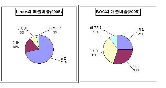 한편, Linde의 2005년 매출은 95억유로(114억달러)로 전년대비 7.3%, 순이익은 5억100만유로(6억300만달러)로 32.0% 증가했으며 BOC의 순이익은 3억6700만파운드로 39.0% 급등했으나 매출은 46억파운로 2004년과 큰 차이가 없었던 것으로 나타났다. 표, 그래프: | Linde의 매출비중(2005) | BOC의 매출비중(2005) | <화학저널 2006/04/10> |