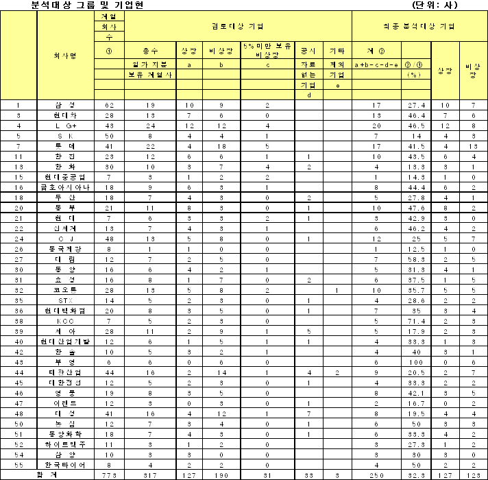 문제성 거래를 한 기업은 38개 대기업 계열사의 25.6%에 달하는 64사로 집계됐다. 참여연대는 문제 소지가 있는 거래를 △회사 기회의 편취 △지원성 거래 △부당주식거래로 구분해 대표적인 사례를 발표했다. 회사 기회의 편취는 계열사의 기존 사업과 밀접한 비상장기업을 설립한 뒤 총수일가가 지분을 획득해 사적인 이익을 취하는 형태로 현대자동차그룹의 글로비스와 신세계그룹의 광주신세계, SK그룹의 SK C&C 등에서 30건이 적발됐다. 또 기존 계열사와 사업 연관성이 밀접하지 않은 기업을 설립한 뒤 총수일가가 지분을 취득하는 지원성 거래도 현대자동차그룹의 엠코, 대한전선그룹의 삼양금속 등에서 20건이 적발됐다. 이와 함께 계열사가 시가보다 싼 가격으로 총수일가와 주식거래를 하거나 사업 관련성이 없는데도 총수 일가가 출자한 기업에 투자하는 부당주식거래 행위도 20건 포착됐다. 참여연대 관계자는 “회사 기회 편취를 묵인한 정도가 심한 것으로 판단되는 정몽구 현대차그룹 회장, 정의선 기아차 사장, 정용진 신세계 부사장 등 일부 기업 임원들을 배임 혐의로 4월2째주에 고발할 계획”이라고 밝혔다. 한편, 이에 대해 상당수 그룹은 자료의 신빙성에 의구심을 제기하면서 참여연대측에서 주관적인 잣대를 들이대 기업들을 죽이려하고 있다고 불만스러운 목소리를 높였다. 한 기업 관계자는 “기업을 둘러싼 경영환경은 외면한 채 일부 자료를 자기 입맛대로 판단해 전체 기업을 부도덕한 곳으로만 매도하고 있다”고 주장했다. 표, 그래프: | 분석대상 그룹 및 기업현황 | <화학저널 2006/04/10> |