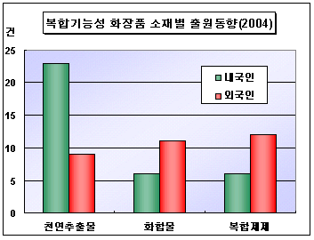 내국인 출원이 35건, 외국인 출원이 32건으로 초기에는 내국인의 출원이 주를 이루었으나, 2004년부터는 외국인의 출원이 급격하게 증가 추세를 보이고 있다. 프랑스가 13건으로 19%, 미국이 6건으로 9%, 일본이 5건으로 7%, 네덜란드가 4건으로 6% 순이다. 복합기능성 화장품 소재는 천연물로부터 유래한 추출물이 33건으로 전체 출원의 약 50%, 합성된 화합물이나 천연물로부터 추출된 화합물에 의한 출원이 17건으로 25%, 하나의 기능성 화장품 효과를 지니는 화합물에 다른 기능을 가진 화합물을 병용한 복합제제가 17건으로 25%를 차지해 주로 천연물을 이용한 복합 기능성 화장품의 출원이 다수를 차지하고 있다. 내국인의 출원은 상백피, 녹차, 백작약, 백강잠, 마가목, 상황버섯, 김치추출물 및 곡류 추출물 등을 이용한 천연물 분야의 출원이 23건이며, 유기 화합물을 이용한 출원이 6건으로 각각 내국인 전체 출원의 66%와 17%를 차지하고 있다. 반면, 외국인의 출원은 복합제제의 출원이 12건으로 전체 출원의 38%, 유기 화합물을 이용한 출원이 11건으로 34%이고, 천연물질로부터 유래한 추출물을 이용한 것은 9건에 불과해 내국인의 출원경향과 대조를 보였다. 복합기능성 화장품은 미백과 주름 개선효과를 지니는 출원이 18건으로 전체 출원의 27%, 미백과 자외선 차단 효과를 동시에 지니는 화장료 조성물의 출원은 8건으로 12%, 미백과 동시에 여드름을 개선시키는 화장료 조성물이 8건으로 12%, 주름개선과 자외선 차단 관련 출원은 5건으로 7%, 주름개선과 여드름개선 효과를 동시에 갖는 출원은 6건으로 9%를 차지했고 이외에도 현대의 다이어트 열풍에 힘입어 슬리밍 기능을 가지는 화장료와 각질제거 효과를 추가로 지니는 복합기능성 화장품에 관한 출원도 있으며, 또한 복합기능성 효과가 3가지 이상인 출원도 다수 있는 것으로 분석됐다. 예를 들면, 여드름개선과 미백 효과 및 주름개선 효과를 동시에 가지는 화장료의 출원은 10건으로 15%, 미백과 자외선 차단효과 및 주름개선 효과를 동시에 가지는 조성물의 출원은 5건으로 7%, 미백과 주름개선 효과 및 자외선 차단 효과에 슬리밍 기능까지 갖춘 화장료도 1건이 출원됐다. 표, 그래프: | 복합기능성 화장품 소재별 출원동향(2004) | <화학저널 2006/04/11> |